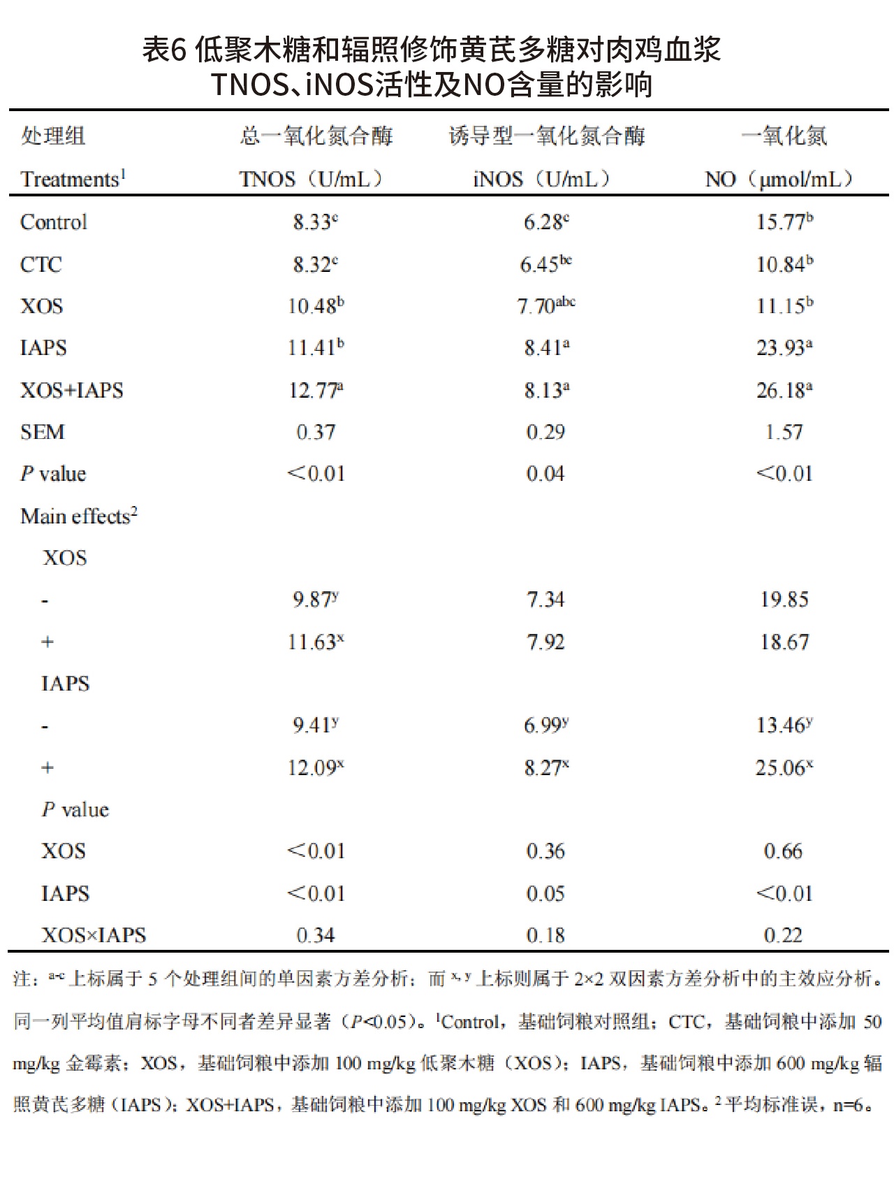 (5)低聚木糖和辐照修饰黄芪多糖对肉鸡血浆TNOS、iNOS活性及NO含量的影响 如表6所示,单因素方差结果显示,XOS和XOS+IAPS组肉鸡血浆TNOS活性显著高于对照组和金霉素组(P<0.05);XOS+IAPS组肉鸡血浆iNOS活性和NO含量显著高于对照组和金霉素组(P<0.05)。