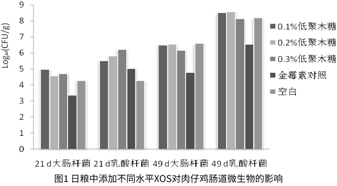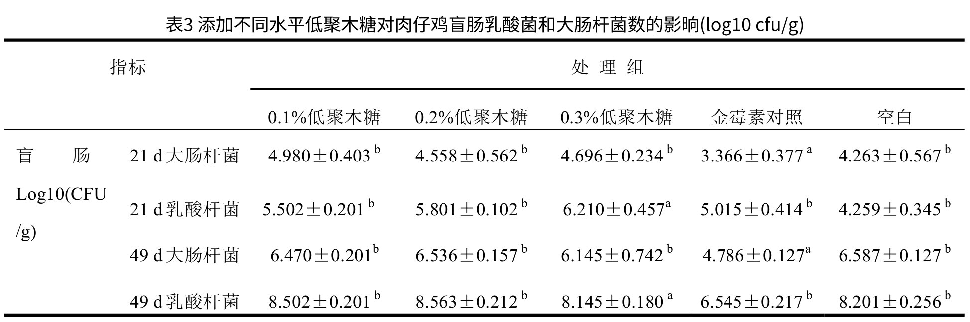 试验结果 (1)饲料中添加XOS对肉仔鸡盲肠肠道菌群的影响 由表3可知,添加0.3%XOS处理组与金霉素组相比可显著提高21d肉仔鸡盲肠内乳酸菌数(P<0.05)。添加0.3%XOS处理组显著提高了49d肉仔鸡盲肠内乳酸菌数(P<0.05)。
