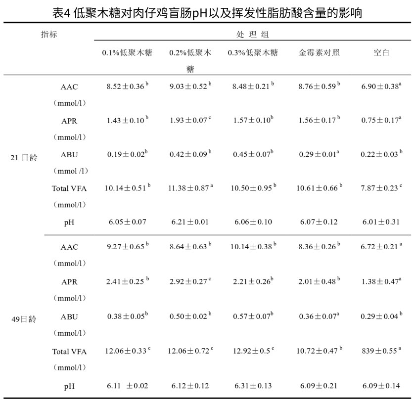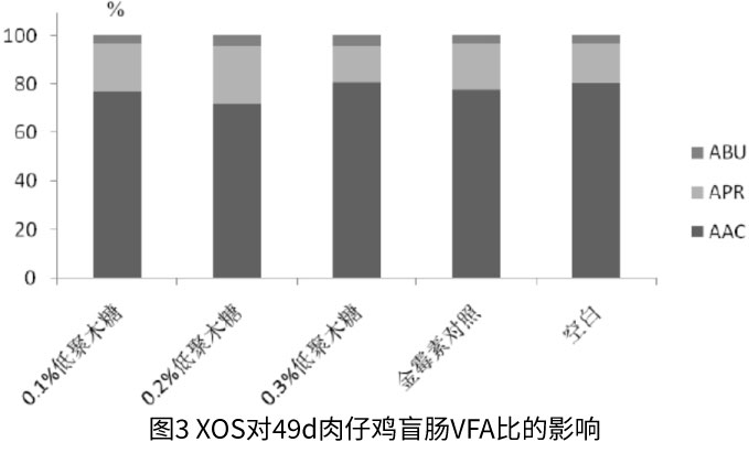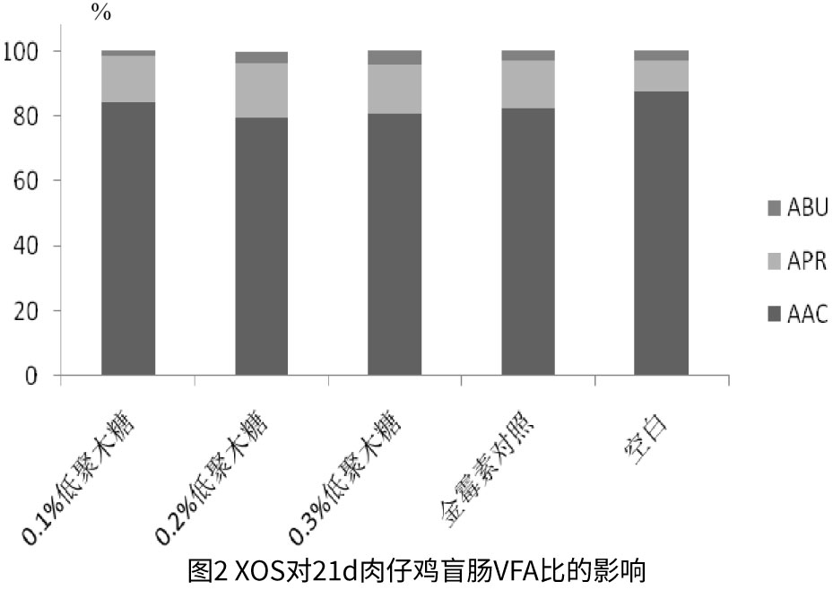 (2)饲料中添加XOS对肉仔鸡盲肠pH值、挥发性脂肪酸的影响 添加 0.1%、0.2%、0.3%XOS处理组与空白对照组相比,均可提高肉仔鸡21 d及49 d盲肠内丙酸、丁酸的含量,当XOS添加量为0.2%时,盲肠食糜丙酸含量最高,对21 d肉仔鸡而言,0.2%XOS处理组为16.96%,比空白对照组提高了6.47%(P<0.05),比金霉素对照组提高了2.92%(P<0.05);对49 d肉仔鸡而言, 0.2%XOS处理组为24.18%,比空白对照组提高了7.67%(P<0.05),比金霉素组提高了5.56%(P<0.05)。添加0.3%的XOS,盲肠食糜中丁酸含量最高,对21 d肉仔鸡而言,比空白对照组提高了1.54%(P<0.05),比金霉素对照组提高了1.57%(P<0.05);对49 d肉仔鸡而言,比空白对照组3.48%相比提高0.93%(P<0.05),比金霉素组提高了1%(P<0.05)。