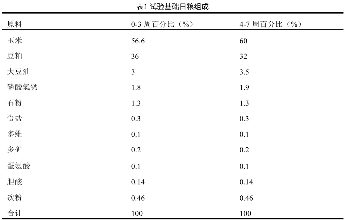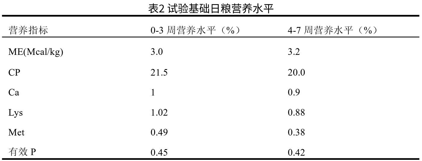 试验目的 本试验以肉仔鸡盲肠食糜为对象研究XOS对肠道微生物产TVFA的影响,为探讨XOS在肠道中的益生作用提供依据,并为有效利用XOS提供参考。 试验设计 选用1日龄AA商品肉仔鸡360只(公母各半),采用单因子区组设计,随机分为5个处理,每个处理6个重复,每个重复12只鸡。5个处理分别为:处理1(对照组),玉米-豆粕型基础日粮;处理2,基础日粮+0.1%XOS;处理3,基础日粮+0.2%XOS;处理4,基础日粮+0.3%XOS;处理5,基础日粮+0.08%金霉素(0-3周)、基础日粮+0.05%金霉素(4-6周)。 试验期49天,试验期间各处理组采用自由采食及饮水。 参照国标(2004)肉仔鸡营养标准配制基础日粮,基础日粮组成和营养水平见表1和表2。
