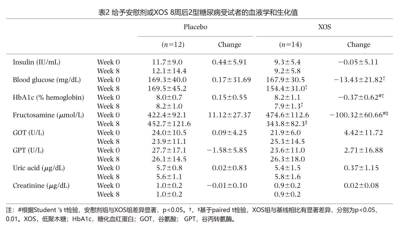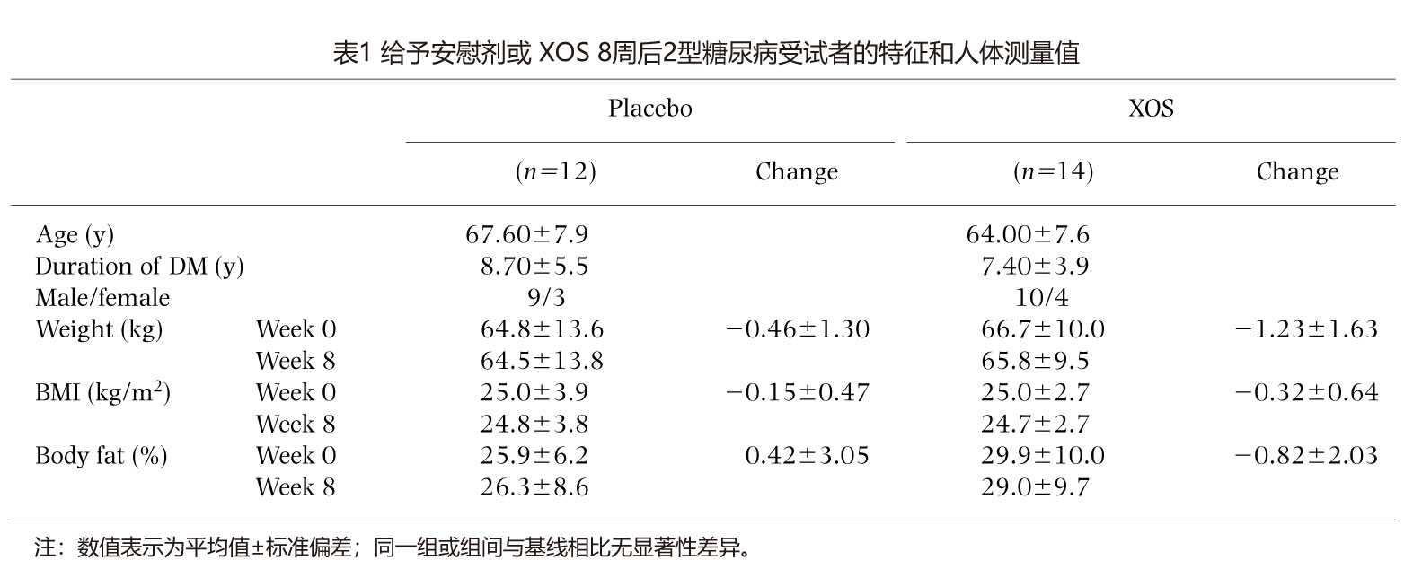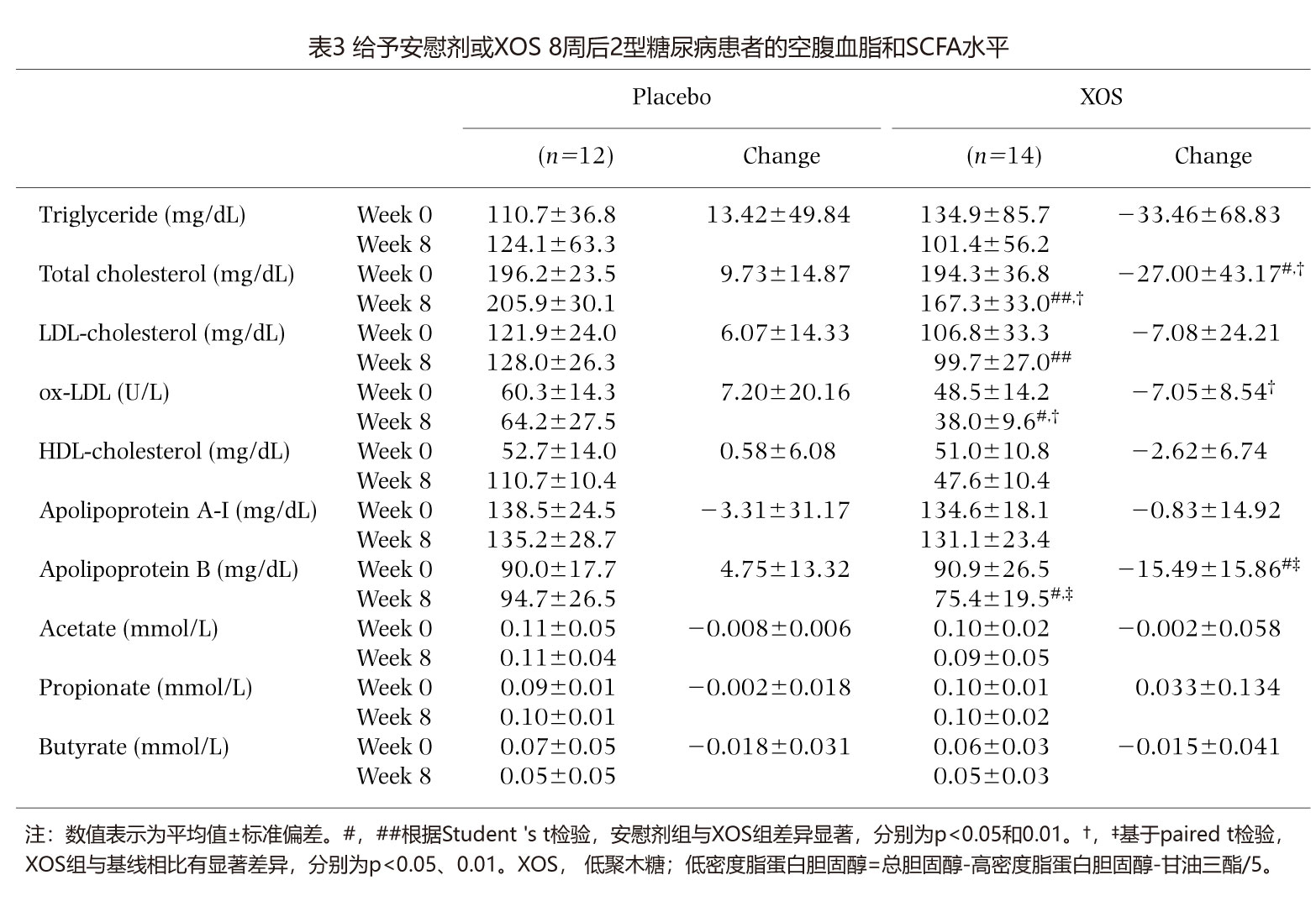 试验设计 实验设计:本研究以台湾台中市退伍军人总医院门诊2型糖尿病患者26例(男19例,女7例)为研究对象,采用双盲、安慰剂对照设计,所有受试者均接受体检和血液检查(包括肝肾功能)。患者无肾脏疾病、心脏病或传染病、胃肠道疾病,过度肥胖(体重指数(BMI)>30)胰岛素和脂质代谢药物治疗,且非吸烟者或抗氧化剂补充剂使用者。糖化血红蛋白(HbA1c)在7.0~10.0%范围内,TG低于400 mg/dL。研究人员要求受试者保持口服降糖药物、饮食习惯和生活方式。向受试者解释本研究的目的和程序,并获得他们的书面同意。XOS组只有一名受试者正在接受饮食治疗,而其他受试者正在服用口服降糖药,在研究开始前没有任何患者开始药物治疗。受试者被随机分配两组,服用4 g/d低聚木糖(XOS)(低聚木糖95P)(n=14)或安慰剂(4 g/d葡萄糖)(n=12)8周。每天的剂量是以装在纸袋里的粉末的形式提供的,病人被要求退回纸袋以评估他们的依从性。病人分两次服用补充剂,一半在早餐时服用,另一半在晚餐时服用。在基线(第0周)和第8周进行抽样收集和测量;计算每个受试者的每个参数的变化。 特性和营养评估:由一位训练有素的营养师对受试者进行面对面的访谈,以评估受试者的特征,包括年龄、性别、身体成分、营养测量和胃肠道(GI)症状。测量身高、体重、体脂等人体测量数据。并采用三维食物回忆法评估膳食摄入量,并根据食物成分表计算营养成分。使用van Munster等人描述的问卷评估8种胃肠道症状。所列症状有:食欲、胃肠道隆隆声、打嗝、肠胃胀气、大便气味、如厕习惯、大便阻力和大便性状,而胃肠不适程度则由无、轻、中到重排列。受试者的空腹静脉血在基线和第8周由医务助理抽取,部分血样经1200×g离心10 min(Hettich Universal 16r,Ger-many)获得血清样品,分析血清胰岛素、果糖胺、甘油三酯、总胆固醇和高密度脂蛋白胆固醇、载脂蛋白A-I、载脂蛋白B、谷氨酸草酰乙酸转氨酶(GOT)水平,谷氨酸丙酮酸转氨酶(GPT)、血尿氮(BUN)、肌酐和SCFA。 氧化状态分析:测定血浆中硫代巴比妥酸反应物(TBARS)浓度和红细胞超氧化物歧化酶(SOD)、过氧化氢酶(CAT)和谷胱甘肽过氧化物酶(GSH-Px)活性,评价受试者的氧化状态;超氧化物歧化酶、过氧化氢酶和谷胱甘肽过氧化物酶的活性数据以单位/克蛋白质表示。采用皮尔斯微量双辛酸(BCA)蛋白测定法测定样品中可溶性蛋白。 SCFA水平分析:测定血清SCFAs水平,包括乙酸、丙酸和丁酸。 试验结果 (1)受试者的特征和营养参数 由表1和表2可知,安慰剂组和XOS组之间的平均年龄和糖尿病持续时间没有差异,而服用XOS 8周后,受试者的葡萄糖、糖化血红蛋白和果糖胺的浓度显著降低。然而,补充XOS不会改变体重、BMI、体脂、胰岛素、GOT、GPT、BUN或肌酐值。 由表3可知,补充XOS 8周后,总胆固醇、低密度脂蛋白胆固醇、氧化低密度脂蛋白和载体蛋白B的值显著下降;然而,XOS补充剂并不影响2型DM受试者的空腹血清短链脂肪酸。上述结果表明,以4 g/d的浓度补充XOS 8周,可以降低2型DM受试者的血糖和血脂水平。