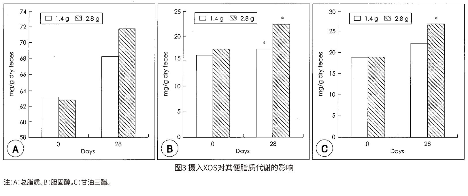 (5)粪便中的脂质浓度 如图3所示,与摄入前相比,摄入XOS后的粪便中总脂质含量没有显著差异;1.4 g组粪便总胆固醇浓度为16.2±4.3 mg/g至17.4±3.7 mg/g,2.8 g组为17.4±3.2 mg/g至22.4±5.4 mg/g,两组均显著增加;1.4 g组摄入前后甘油三酯浓度无显著差异,但2.8 g组摄入前后显著升高。