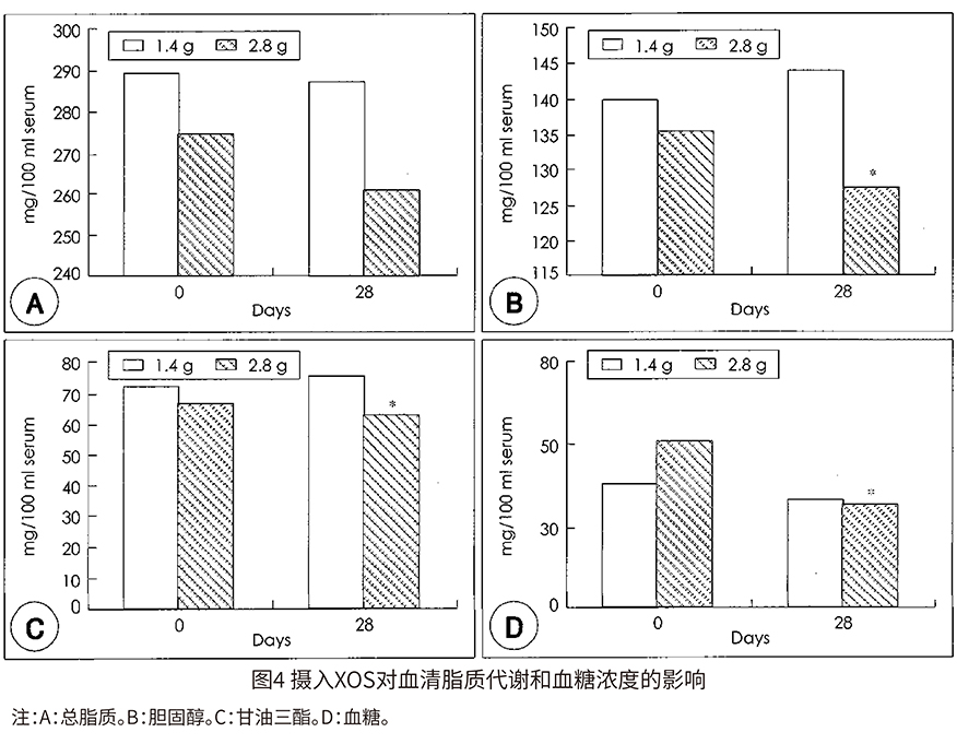 (6)血脂和血糖变化 如图4所示,摄入XOS后,1.4 g和2.8 g组血脂总量均呈下降趋势,但不显著;每天摄入2.8 g XOS时,总血清胆固醇和甘油三酯显著降低。摄入XOS后,两组的血糖浓度均有下降的趋势,但2.8 g组的下降趋势具有显著差异。