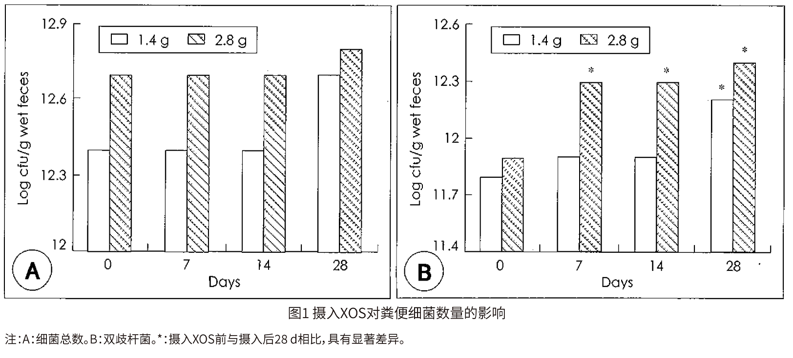 (3)粪便中微生物数量的变化 如图1所示,双歧杆菌的数量随着摄入XOS而增加,1.4 g组在第28 d出现明显的增加,2.8 g组在摄入7 d后显著增加并保持稳定。