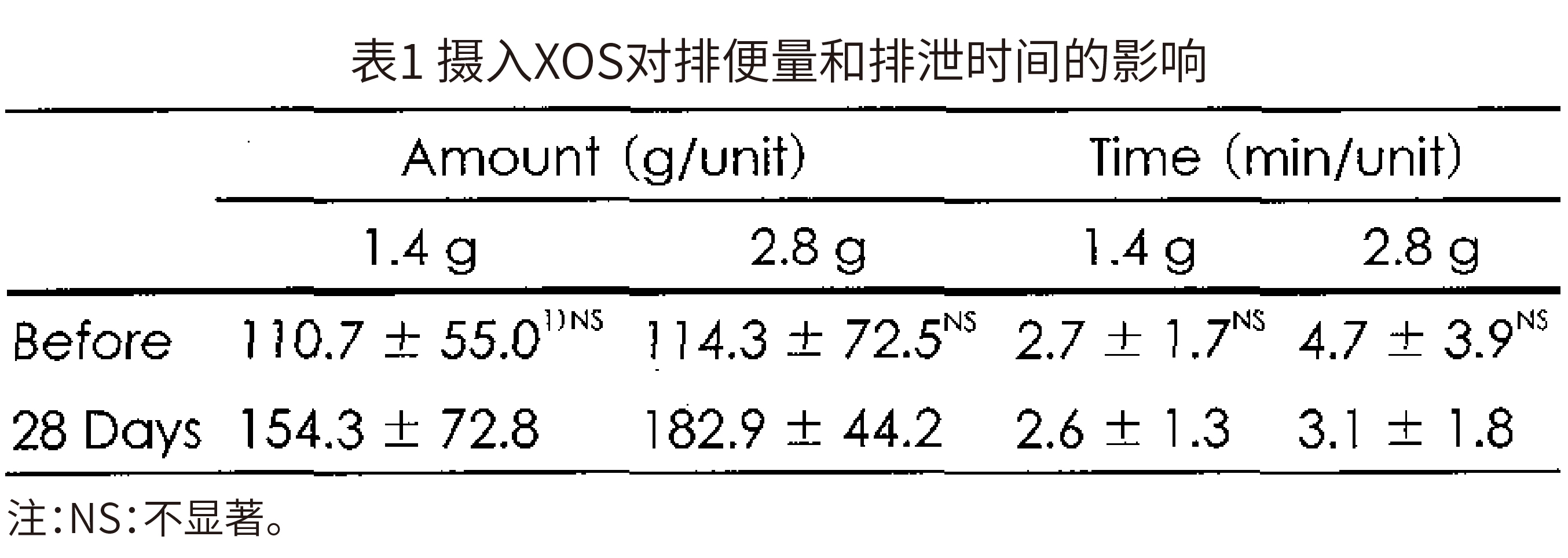 试验设计 选择16名健康女性(23~26岁)作为受试者,将受试者分为两组,连续摄入XOS 28 d,每天分别摄入1.4和2.8 g。摄入XOS后,通过问卷进行与排便有关的调查,每次获取粪便样本,制作粪便重量和排便所需时间的排便日志。在摄入XOS前、摄入后第7 d、摄入后第14 d、摄入后第28 d共采集4次粪便。测量粪便重量、粪便pH、粪便含水量和粪便微生物。 试验结果 (1)排便特征变化 如表1所示,摄入XOS后,平均排便量和排便时间在1.4 g或2.8 g组中没有显著差异。