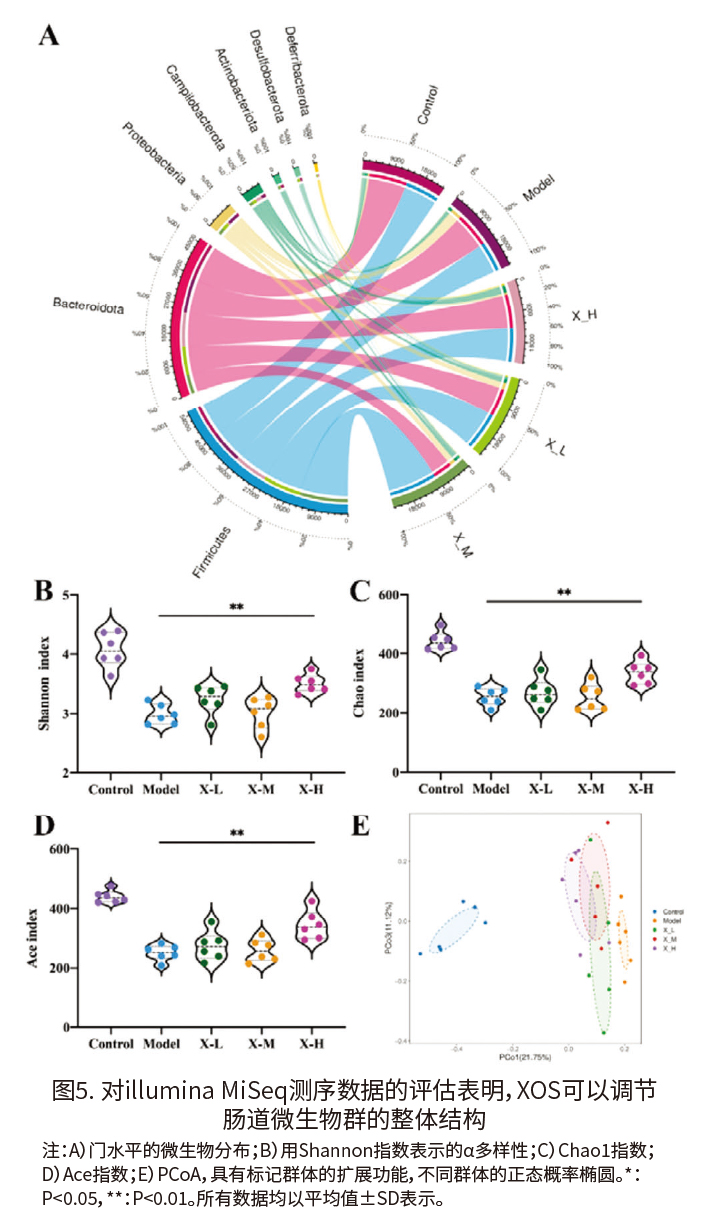 (5)XOS对肠道微生物群的影响 如图5A所示,使用番泻叶提取物的小鼠的肠道微生物结构出现了显著的改变。在对照组中,主要的门类是厚壁菌门(42.75%)、拟杆菌门(47.21%)、变形菌门(2.46%)、弯曲菌门(1.60%)和放线菌门(2.83%)。然而,在门水平上,番泻叶提取物处理后细菌有明显的变化,变形菌门和弯曲菌门的相对丰度增加到13.20%和3.97%,而厚壁菌门、拟杆菌门、放线菌门和脱硫弧菌门的相对丰度分别下降到43.26%、37.67%、1.09%和0.228%。此外,与模型组相比,不同剂量的XOS干预处理在门水平上的细菌变化是不同的。在0.50 mg g-1 BW day-1的XOS干预处理下,厚壁菌门和放线菌门的相对丰度分别显著增加到59.90%和2.69%,而变形菌门的相对丰度下降到7.41%。在1.00 mg g-1 BW day-1 XOS的干预下,变形菌门的相对丰度显著下降到2.61%。 如图5B-5D所示,模型组中用Chao1指数和Ace指数测定的平均丰富度较低,而Chao1指数和Ace指数随着XOS处理的进行而增加,尤其是1.00 mg g-1 BW day-1 XOS组,这些结果与Shannon指数的结果一致。α-多样性是通过主坐标分析(PCoA)的加权UniFrac距离来反映的。图5E显示,XOS干预治疗可以缓解番泻叶提取物引起的肠道微生物群的变化。