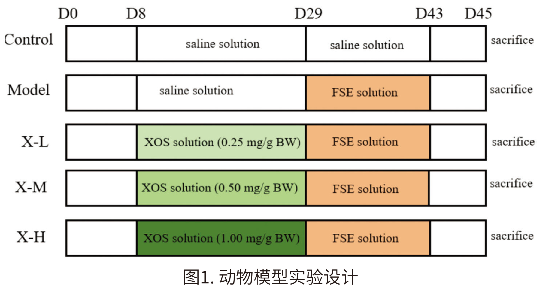 试验设计 原料:低聚木糖;番泻叶。 番泻叶提取物的制备:将番泻叶用中药机打碎,用网筛过筛;将番泻叶粉末在100℃的水中浸泡10分钟,液料比例为5:4,然后将浸泡液以8000×g离心10分钟,在4℃下保存,这相当于0.8 g mL-1的粗制药物。 小鼠实验的分配和剂量信息:KM小鼠在特定无病原体(SPF)条件下饲养,适应喂养一周后将小鼠随机分为五组,每组8只小鼠。实验过程如图1所示。对照组每天喂食200 μL生理盐水(D8-D42);模型组喂食200 μL生理盐水(D8-D28)和番泻叶提取物(D29-D42)。而三个XOS组口服200 μL不同浓度的XOS溶液(D8-D28)和番泻叶提取物(D29-D42)。口服XOS的浓度为0.25、0.50和1.00 mg g-1 BW day-1。在实验过程中,每周测量体重。
