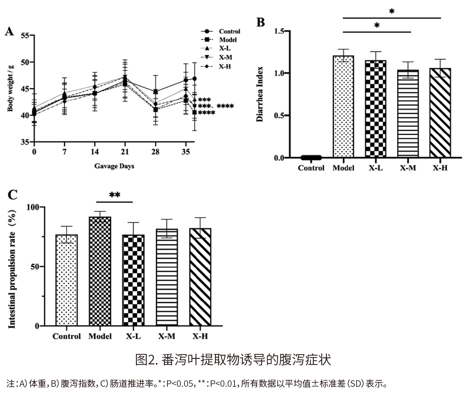 腹泻指数的测定:通过统计每只小鼠的稀便次数、总稀便次数和稀便等级来计算腹泻指数。稀便率=稀便总数/大便总数。腹泻指数=稀便率×平均稀便程度(根据滤纸染色直径分为0-4级;1级:染色直径<1厘米,2级:染色直径为1-1.9厘米,3级:染色直径为2-3厘米,4级:染色直径>4厘米)。 肠道推进试验的测量:在实验中,每组随机选择4只小鼠进行小肠推进试验。实验的第45天,在单笼中随机选择每组4只小鼠。实验前小鼠禁食12小时,并喂以0.4毫升酚红溶液(0.04%)。间隔30分钟后,杀死小鼠并收集从胃到回盲部交界处的片段。酚红推进率(%)=酚红的迁移距离/小肠全长×100%。 结肠组织学的评估:收集新鲜的结肠组织,并在多聚甲醛溶液中固定48小时,分别用酒精和石蜡脱水和包埋。然后将结肠切片,用苏木精和伊红(H&E)进行染色,用倒置显微镜观察结肠病理。 结肠组织中细胞因子和D-乳酸(D-LA)水平的测定:白细胞介素(IL)-6、IL-10、TNF-α,、血管生成素(Ang1)和D-LA的浓度用市售的ELISA试剂盒测量,结肠组织用磷酸钾缓冲液(1%蛋白酶抑制剂鸡尾酒)匀浆,在4℃下12000×g离心20分钟。采用BCA法用BCA蛋白测定试剂盒测定蛋白浓度。 紧密连接(TJ)蛋白的测定:通过免疫组化和ELISA方法测定闭锁蛋白和ZO-1的浓度。为了进行免疫组化分析,将福尔马林固定的结肠组织处理后切片,组织切片用苏木精进行反染色,用显微镜对组织切片进行研究。对于ELISA分析,用市售的ELISA试剂盒测量结肠组织上清液中的闭锁蛋白和ZO-1的浓度,用磷酸二氢钾缓冲液匀浆,4℃下12000×g离心20分钟;用BCA蛋白测定试剂盒测定蛋白浓度。 SCFAs的测定:在第43天收集每只小鼠排泄的新鲜粪便样品,冷冻并储存在-80℃。将50 mg粪便样品加入500 μL 0.9%NaCl溶液中,用40 μL 10%H2SO4进行酸化。加入1 mL二乙醚后,将溶液剧烈摇晃30分钟。然后,通过在4℃下以12000×g离心混合溶液20分钟,在二乙醚相中获得SCFAs。最后,用GC-MS方法测定SCFAs。 16S rRNA基因测序和生物信息学分析:使用FastDNA Spin Kit for Feces(MP Biomedicals, LLC, Irvine, CA, USA)提取粪便样品的DNA。通过引物对(341F:5′-CCTAYGGGRBGCASCAG-3′;806R:5′GGACTACNNGGGTATCTAAT-3′)扩增16S rRNA测序基因(V3-V4)。随后,使用Qiagen凝胶提取试剂盒(Germantown, MD, USA)对混合PCR产物进行纯化。使用TruSeq DNA PCR-Free Sample Preparation Kit(SanDiego, CA, USA)将所有的样本汇集起来,制备测序文库。库的质量用Agilent 2100生物分析仪测量。最后,在Illumina HiSeq 2500平台上对文库进行测序,并产生250 bp的成对末端读数。 试验结果 (1)XOS对小鼠生理观察的影响 在喂食实验中,小鼠从第8天到第28天口服补充XOS,然后从第29天到第42天服用番泻叶提取物。模型组小鼠经过14天的番泻叶提取物处理后出现了腹泻症状,说明腹泻模型的建立是成功的。 如图2A所示,体重随着番泻叶提取物的摄入而下降。在模型组中,与小鼠的初始体重相比,体重下降了11.5%。然而,对照组小鼠的体重没有显示出明显的差异。不同浓度的XOS干预在改善体重下降方面发挥了类似的作用,而0.50 mg g-1 BW day-1的XOS能显著改善体重。 如图2B所示,试验结束时,模型组的DAI评分为1.210,说明XOS的干预对DAI评分有缓解作用,0.25和0.50 mg g-1 BW day-1剂量XOS干预组的腹泻指数分别为1.038和1.059(pX-M<0.05,pX-H<0.05)。 如图2C所示,与模型组(91.94%)相比,0.25 mg g-1 BW day-1 XOS组的胃肠道推进力显著下降到76.71%。
