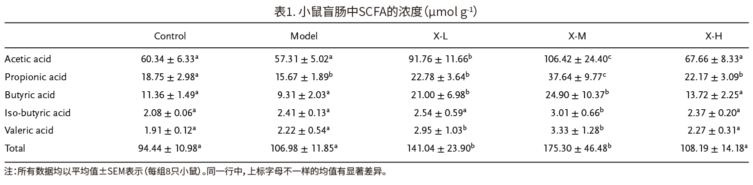 如图4B-4D所示,模型组的ZO-1和闭锁蛋白的平均光密度低于对照组。而用XOS的干预处理减弱了破坏的模式,并显著扭转了ZO-1和occludin蛋白的表达变化。与对照组相比,腹泻模型组的TJ蛋白浓度显著下降,ZO-1和occludin蛋白的浓度分别只有30和20 pg mg-1蛋白。虽然通过不同剂量的XOS干预,肠道屏障得到了改善,但TJ蛋白的浓度却有不同的改善。值得注意的是,0.50 mg g-1 BW day-1的XOS干预治疗使ZO-1和occludin的浓度分别增加了89.6%和90.7%。总的来说,0.50 mg g-1 BW day-1的XOS发挥了最显著的肠道屏障保护作用。 (4)XOS对SCFAs的影响 由表1可知,在XOS干预治疗组与对照组和模型组之间,SCFAs的总浓度和单个浓度是不同的。乙酸(57-106 μmol g-1)是小鼠粪便中形成的主要SCFAs,其次是丙酸(15-37 μmol g-1)、丁酸(9-24 μmol g-1)、异丁酸(2-3 μmol g-1)和戊酸(1.9-3.3 μmol g-1),乙酸、丙酸、丁酸和异丁酸分别占SCFAs总量的60-65%、15.6-21.7%、8.6-14.9%和1.7-2.3%,还检测到一定数量的戊酸(1.9-3.3 μmol g-1)。与模型组和对照组相比,使用0.50 mg g-1 BW day-1 XOS干预的乙酸、丙酸、丁酸、异丁酸和戊酸的浓度分别为106.4、37.6、24.9、3.0和3.3 μmol g-1。这些结果表明XOS的量对SCFAs的产生有影响。