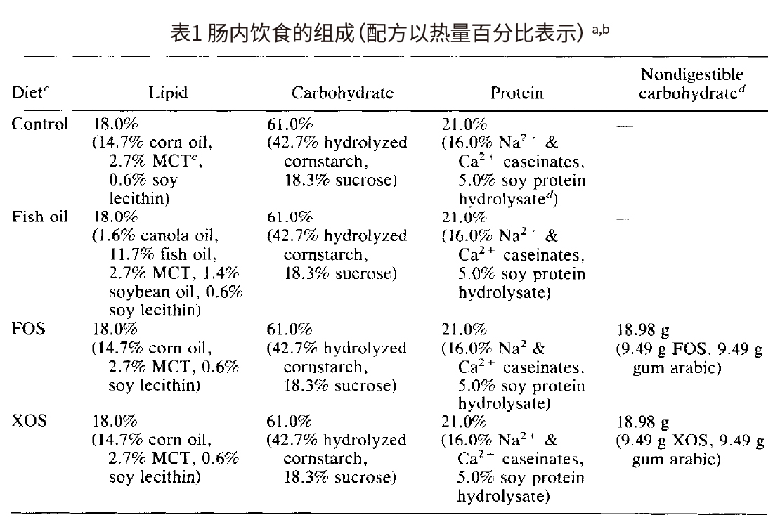 试验设计 采用特异性无病原体的雌性Lewis大鼠(175~200 g)作为试验研究对象,第一组试验,将大鼠随机分为3组,Sham chow组(假手术对照组,n=10)、PG/PS chow组(结肠炎组,n=29)和SAZ组(在诱导结肠炎后立即在其饮水中给予柳氮磺吡啶(SAZ)的组(100 mg/kg/d,n=8),通过注射纯化肽聚糖-多糖(PG/PS)诱导结肠炎;第二组试验,将大鼠随机分为6组,Control(No PG/PS)组(喂食对照饮食的假手术组,n=7)、Chow组(喂食饲料的结肠炎组n=29),以及喂食肠内饮食的四个结肠炎组,如表1和表2所示,Control组(肠内饮食,n=7)、Fish Oil组(补充FO的肠内饮食,n=8)、FOS组(补充FOS的肠内饮食,n=8)和XOS组(补充XOS的肠内饮食,n=8)。所有大鼠在结肠炎诱导前接受1周饲喂,随后再接受3周饲料或肠内配方。实验为期4周,包括诱导前和注射后。日采食量和体重每24小时记录一次。标准大鼠实验室饲料包括22%的蛋白质、5%的脂肪和4.5%的纤维。