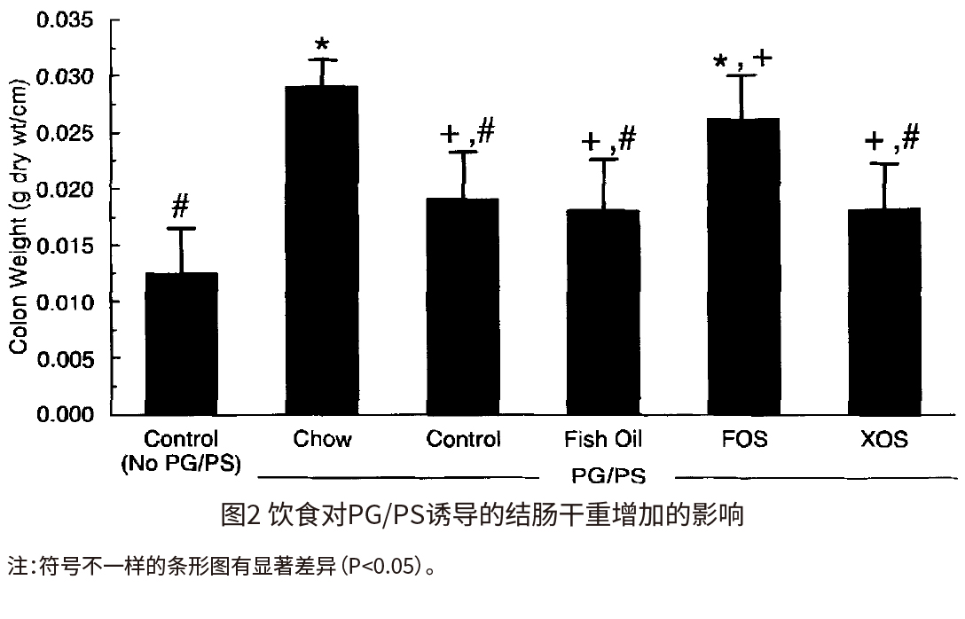(2)结肠组织学分析 如图1所示,PG/PS处理3周后,出现大量炎症细胞浸润和粘膜下肉芽肿的形成,肠间质表现出广泛的纤维化,导致肠壁增厚,并失去清晰的肌层;与结肠炎动物组相比,SAZ治疗抑制了白细胞浸润;与结肠炎动物组相比,补充XOS动物组的粘膜和粘膜下层组织正常,炎症细胞的数量很少或没有增加。 ![]() (3)饮食对PG/PS诱导的结肠干重的影响 如图2所示,与Chow组相比,XOS组显著减弱了PG/PS诱导的结肠重量增加,并与Control(No PG/PS)组相当。