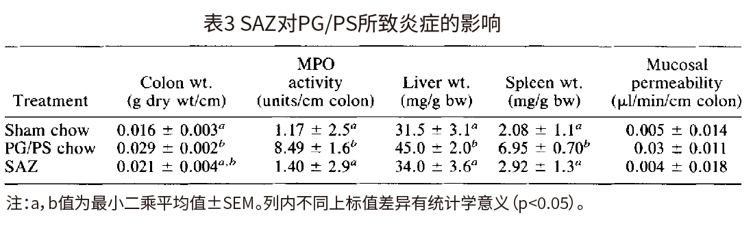 麻醉后切开气管,插管右股动脉,记录动脉压和取血,右股静脉插管注射同位素标记物,用51铬标记的乙二胺四乙酸(51Cr-EDTA)的血液到腔内的清除率确定粘膜渗透性。测定粘膜渗透性后,大鼠安乐死,切除降结肠并纵向打开,记录灌注段长度和重量,切片并保存组织,用于组织学、干湿比和髓过氧化物酶(MPO)的测定。记录肝脏和脾脏重量;记录结肠标本的湿重,及80℃处理48 h后的干重;取远端结肠、肝脏和脾脏进行组织学分析,并测定结肠MPO活性。 试验结果 (1)SAZ对PG/PS诱导炎症的影响 如表3所示,诱导结肠炎后立即口服SAZ,可显著减弱MPO活性的增强,但结肠重量和粘膜渗透性无显著变化,表明SAZ可抑制粒细胞浸润。SAZ治疗减轻PG/PS引起的肝脏和脾脏重量增加,表明SAZ抑制了肉芽肿性炎症和坏死。