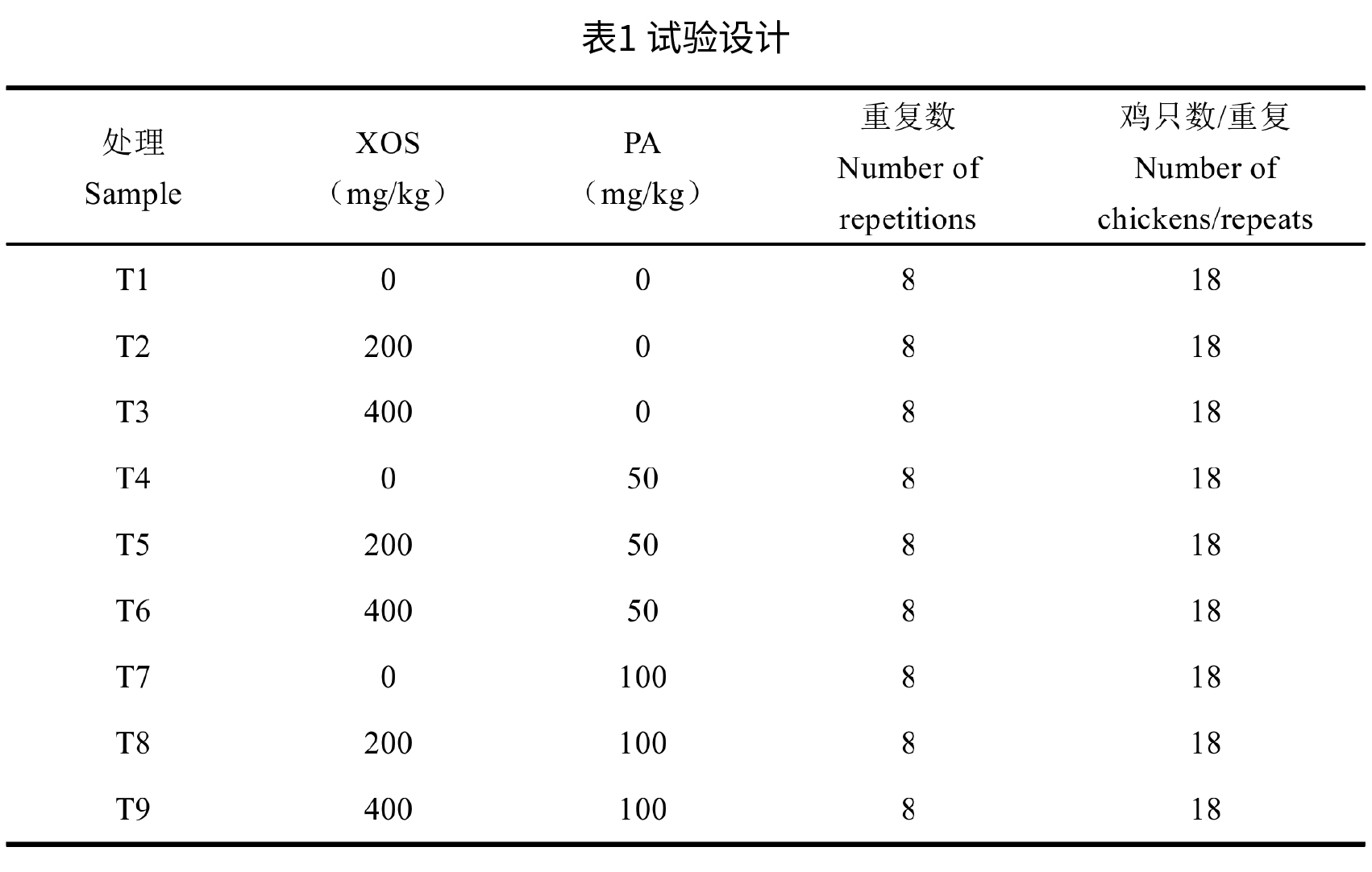试验目的 本试验旨在研究低聚木糖和乳酸片球菌对蛋鸡产蛋性能和蛋品质的影响。 试验设计 本试验采用3×3二因子试验设计(见表1),XOS设三个添加水平,分别为:0、200、400 mg/kg;乳酸片球菌(PA CNCMI-4622)设三个添加水平,分别为:0、50、100mg/kg。选用1296只48周龄体重相近、机体健康的罗曼粉蛋鸡进行试验,预饲期2周,正式期12周。依据产蛋率无差异原则,随机分为9个处理,每个处理8个重复,每个重复18只鸡。 试验以玉米-豆粕型为基础饲粮,根据NRC(1994)和中国鸡饲养标准(NY/T33-2004)推荐的营养水平以及参考罗曼粉商品蛋鸡饲养管理指南来设计饲料配方,并结合养殖场生产实际来配制饲粮,全期使用粉料。XOS和PA CNCMI-4622均采用逐级预混合的方式来配制。基础饲粮组成及营养水平见表2。 XOS含量为35%。PA CNCMI-4622活菌含量为≥108CFU/g。 饲养日产蛋率(%)=蛋总数(枚)/饲养日鸡只数(只)*100%。 入舍鸡产蛋率(%)=蛋总数(枚)/入舍鸡只数(只)*100%。 平均蛋重(g)=蛋重(g)/产蛋数(枚)。 平均采食量(g)=耗料量(g)/鸡只饲养量(只)。 料蛋比=采食量(kg)/总蛋重(kg)。 入舍鸡产蛋数=产蛋数(枚)/入舍鸡只数(只)。