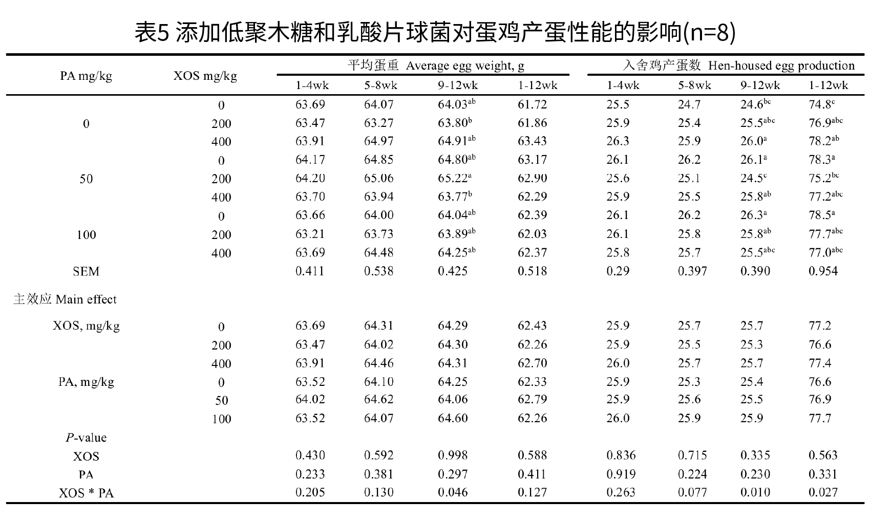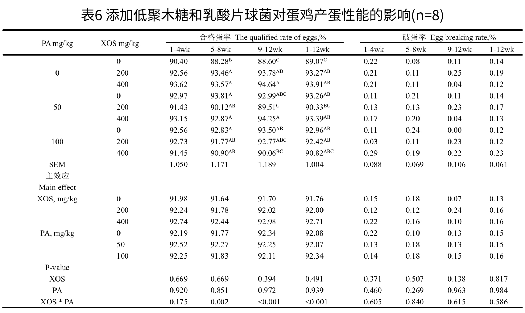 试验结果 (1)添加低聚木糖和乳酸片球菌对蛋鸡产蛋性能的影响 添加XOS和PA对蛋鸡生长性能的影响见表3、4、5和6。 双因素分析发现,添加不同水平XOS和PA在蛋鸡5~8周、9~12周、1~12周的日产蛋率和合格蛋率,9~12周、1~12周入舍鸡产蛋率、料蛋比及入舍鸡产蛋数,9~12周平均蛋重存在显著交互效应(P<0.05)。 在日产蛋率和合格蛋率上,单独添加XOS 200、400 mg/kg得到显著提高。 在料蛋比上,单独添加以XOS 400 mg/kg最低,1~12周以PA 100 mg/kg和XOS 200 mg/kg联用组低。 在平均蛋重,以PA 50 mg/kg和XOS 200 mg/kg联用组最高。