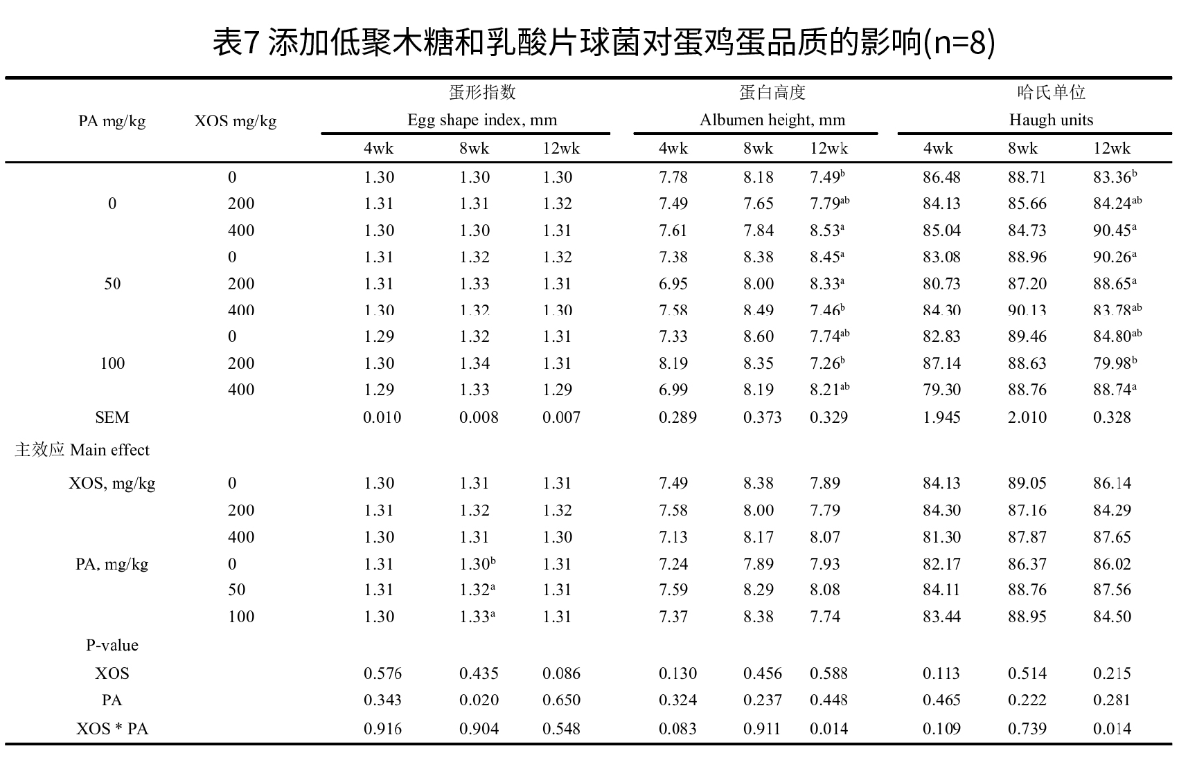 (2)添加低聚木糖和乳酸片球菌对蛋鸡蛋品质的影响 添加XOS和PA对蛋鸡蛋品质的影响见表7、8、9和10。 结果表明,试验第4周时,添加不同水平XOS和PA在蛋黄颜色和蛋黄指数有交互作用(P≤0.03),在蛋黄颜色上,PA 50 mg/kg和XOS 200、400 mg/kg联用及PA 100 mg/kg和XOS 400 mg/kg联用与单独添加PA 100 mg/kg相比显著提高;在蛋黄指数上,单独添加XOS 200、400 mg/kg和单独添加PA 50、100mg/kg均显著提高,但联用组体现出进一步提高。从主效应看,添加XOS 400 mg/kg有提高蛋黄颜色趋势(P=0.054)。 试验第12周时,添加不同水平XOS和PA在蛋白高度、哈氏单位和蛋黄颜色上具有交互效应(P<0.05)。在蛋白高度和哈氏单位,以单独添加XOS 400 mg/kg最高。