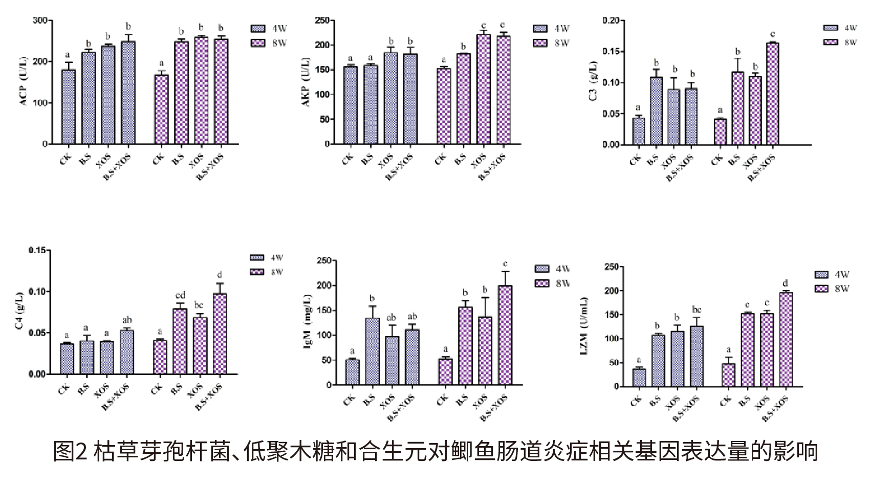试验目的 研究单独或联合添加枯草芽孢杆菌、低聚木糖对鲫鱼生长性能、免疫功能及肠道健康的影响。 试验设计 将420尾(9.77±0.04 g)鲫鱼随机分到12个桶,每桶35尾鱼,共分为4组,包括对照组(CK)、枯草芽孢杆菌组(B.S)、低聚木糖组(XOS)和合生元组(B.S+XOS),每组3重复。对照组投喂基础饲料,枯草芽孢杆菌组投喂基础饲料加枯草芽孢杆菌(作用浓度为1×108 CFU/g),低聚木糖组投喂基础饲料加低聚木糖(作用含量为0.1%),合生元组投喂基础饲料加枯草芽孢杆菌和低聚木糖,每天投喂3次(7:00、12:00和17:00),饲养8周。 在第4周和第8周取样,每桶随机取6尾鱼,取样前禁食24 h,通过尾静脉取血,收集血清放置于-20℃。收集肠道组织迅速放置于液氮中,然后转移至-80℃冰箱中保存。 在8周养殖试验结束后,称取测量鱼的体质量和体长,计算鲫鱼生长指标。生长指标相关计算公式如下: 增质量率(WG,%)=100×(末体质量-初始体质量)/初始体质量; 特定生长率(SGR,%/day)=100×[Ln(末体质量)-Ln(初始体质量)]/养殖天数; 饲料利用率(FE,%)=100×[增加的体质量/摄食量]; 蛋白质效率(PE,%)=100×[增加的体质量/(摄食量×饲料蛋白质含量)]。 提取鲫鱼肠道RNA并反转录为cDNA,以cDNA为模板,按照试剂盒说明书操作,采用荧光染料法在ABI 7500系统中进行qPCR,对肠道免疫相关基因包括IL-1β、IL-10、TNF-α和TGF-β进行检测。所得数据采用2-ΔΔCT方法进行处理分析,引物序列见表1。