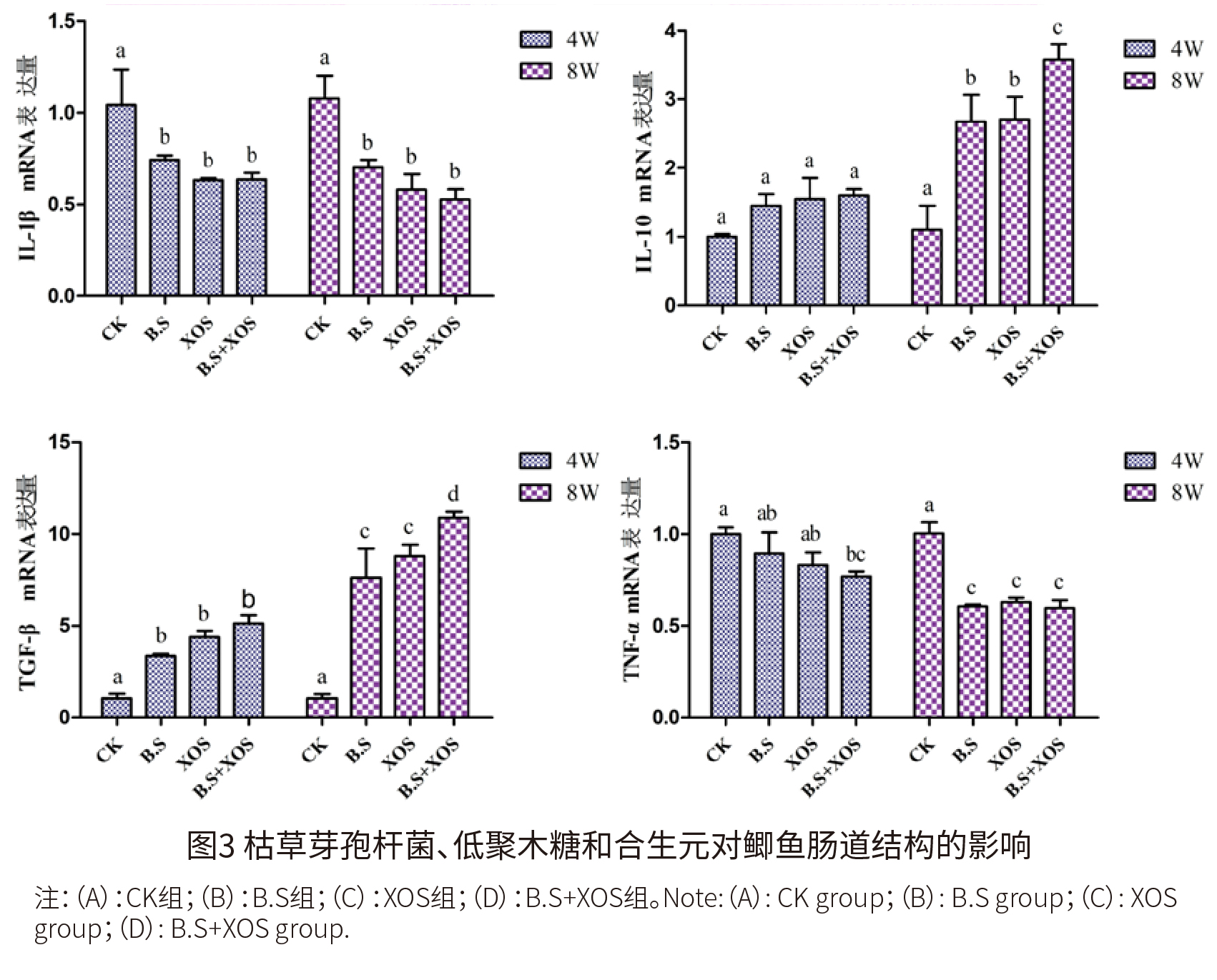 (3)枯草芽孢杆菌、低聚木糖和合生元对鲫鱼肠道免疫相关基因表达量的影响 如图2所示,与CK组相比,B.S组、XOS组和B.S+XOS组的IL-1β mRNA表达量在第4周和第8周时均显著降低(P<0.05)。与CK组相比,B.S组、XOS组和B.S+XOS组的IL-10和TGF-β mRNA表达量在第8周时显著升高(P<0.05),且在第8周时,B.S+XOS组显著高于B.S组和XOS组(P<0.05),但是各组间IL-10mRNA表达量在第4周时无显著差异(P>0.05)。与CK组相比,B.S组、XOS组和B.S+XOS组TNF-α的mRNA表达量在第8周时显著降低(P<0.05),但是在4周时,仅有B.S+XOS组表达量显著降低(P<0.05)。
