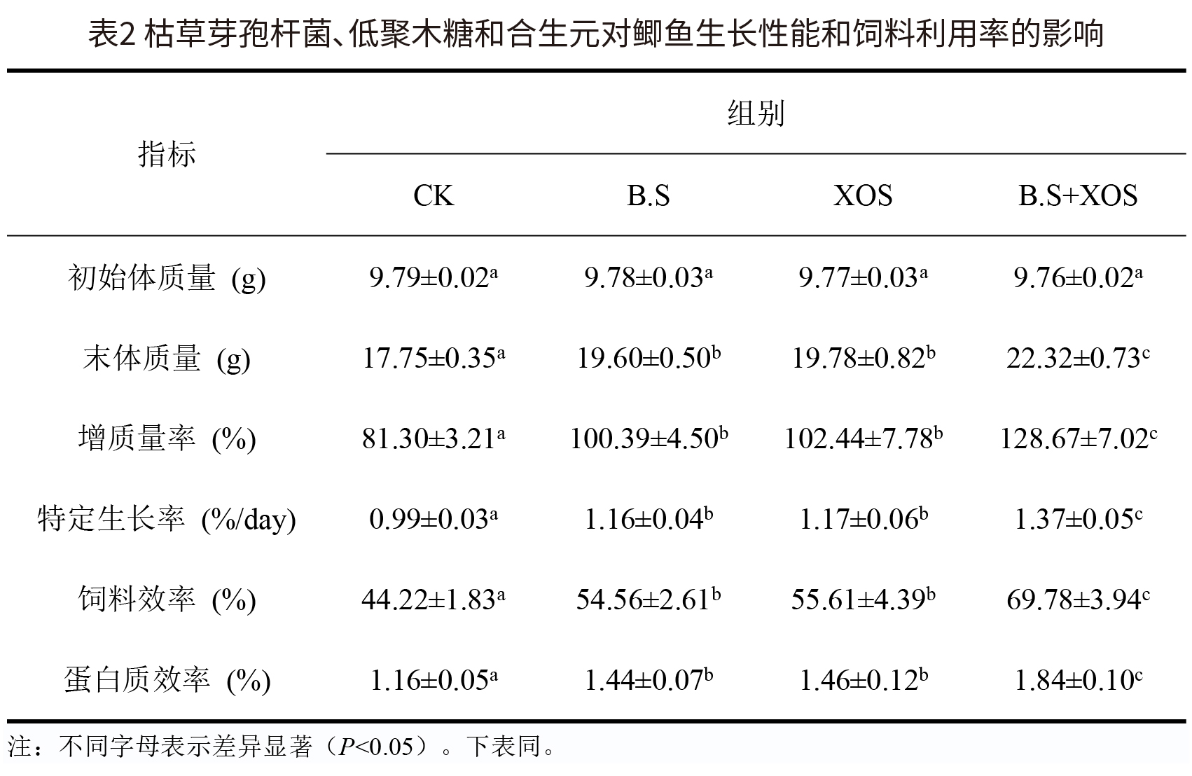 试验结果 (1)枯草芽孢杆菌、低聚木糖和合生元对鲫鱼生长性能的影响 生长性能结果如表2所示。枯草芽孢杆菌组(B.S)、低聚木糖组(XOS)和合生元组(B.S+XOS)组的末体质量(FW)、增质量率(WG)、特定生长率(SGR)、饲料效率(FE)和蛋白质效率(PE)显著高于CK组(P<0.05)。B.S+XOS组的末体质量、增质量率、特定生长率、饲料效率和蛋白质效率均显著高于B.S和XOS组(P<0.05)。