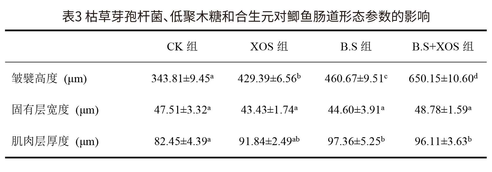 (4)枯草芽孢杆菌、低聚木糖和合生元对鲫鱼肠道结构的影响 如图3和表3所示,与对照组相比,B.S组、XOS组和B.S+XOS组的皱襞高度显著增高(P<0.05),且B.S+XOS组显著高于B.S组和XOS组。各组别之间固有层宽度无显著差异(P>0.05)。B.S组和B.S+XOS组肌肉层厚度显著高于对照组(P<0.05),XOS组与CK组无显著差异(P>0.05)。