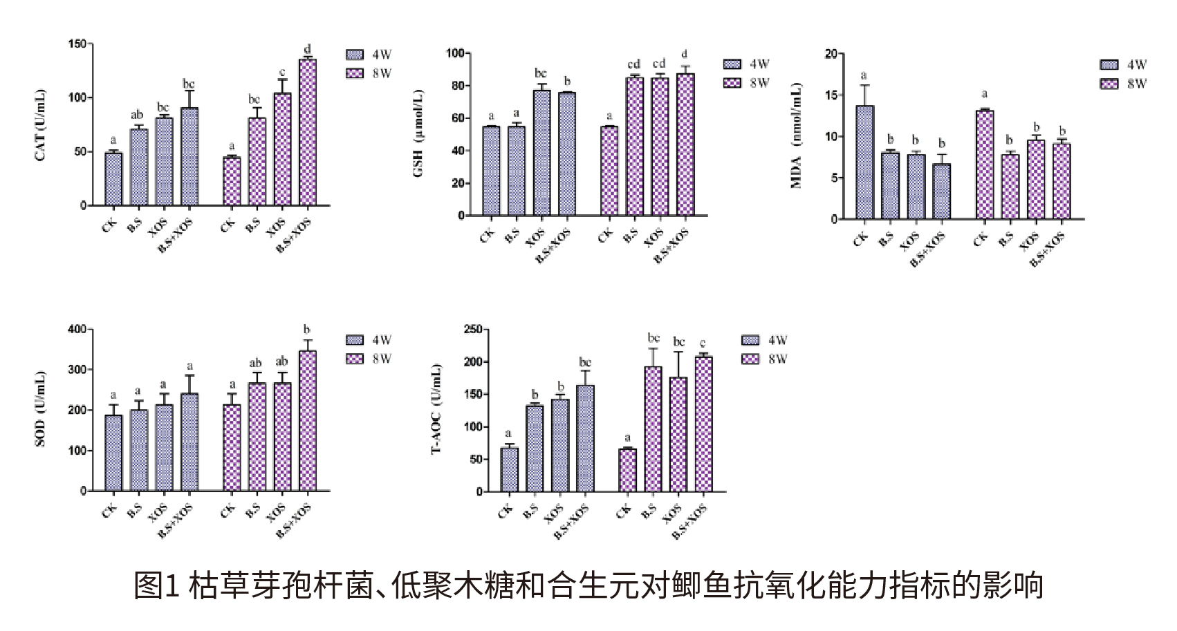 (2)枯草芽孢杆菌、低聚木糖和合生元对鲫鱼抗氧化能力指标的影响 在第4周和第8周对鲫鱼血清抗氧化能力相关指标进行了检测,结果如图1所示。在第4周和第8周B.S组、XOS组和B.S+XOS组的T-AOC水平显著高于CK组(P<0.05),MDA水平显著低于CK组(P<0.05)。在第4周,SOD水平在各组别之间无显著差异(P>0.05),在第8周B.S+XOS组显著高于CK组(P<0.05)。在第4周XOS组和B.S+XOS组的CAT水平显著高于CK组(P<0.05),在第8周B.S组、XOS组和B.S+XOS组的CAT水平显著高于CK组(P<0.05),且B.S+XOS组显著高于B.S组和XOS组(P<0.05)。在第4周和第8周XOS组和B.S+XOS组的GSH水平均显著高于对照(P<0.05),B.S组在第4周与CK组无显著差异(P>0.05),第8周显著高于对照(P<0.05)。