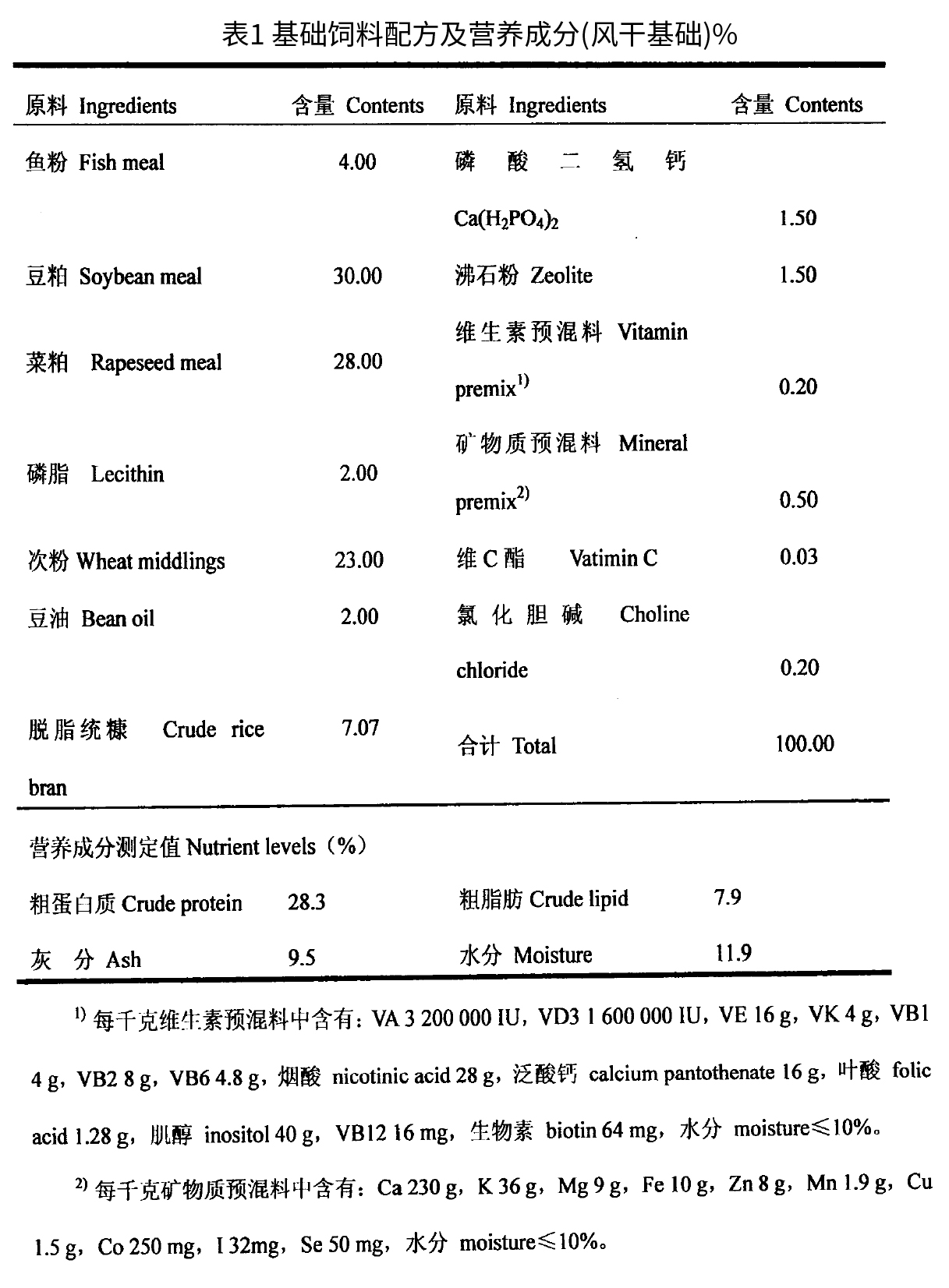试验目的 本试验以奥尼罗非鱼为研究对象,研究了低聚木糖对罗非鱼肠道形态和对双歧杆菌、乳酸菌和大肠杆菌数量的影响,以便丰富低聚木糖在鱼类的作用效果,为低聚木糖在罗非鱼饲料中的应用提供相应的理论依据。 试验设计 选取平均体重为(5.09±0.12)g的幼鱼960尾,随机分成6组,每组设4个重复,每个重复40尾鱼,分别投喂基础饲料和5种试验饲料(在基础饲料中分别添加200 mg/kg、400 mg/kg、600 mg/kg、800 mg/kg和1000 mg/kg的低聚木糖),记作G0、G200、G400、G600、G800和G1000。 试验用基础饲料配方的组成及营养水平见表1。低聚木糖纯度≥95%。