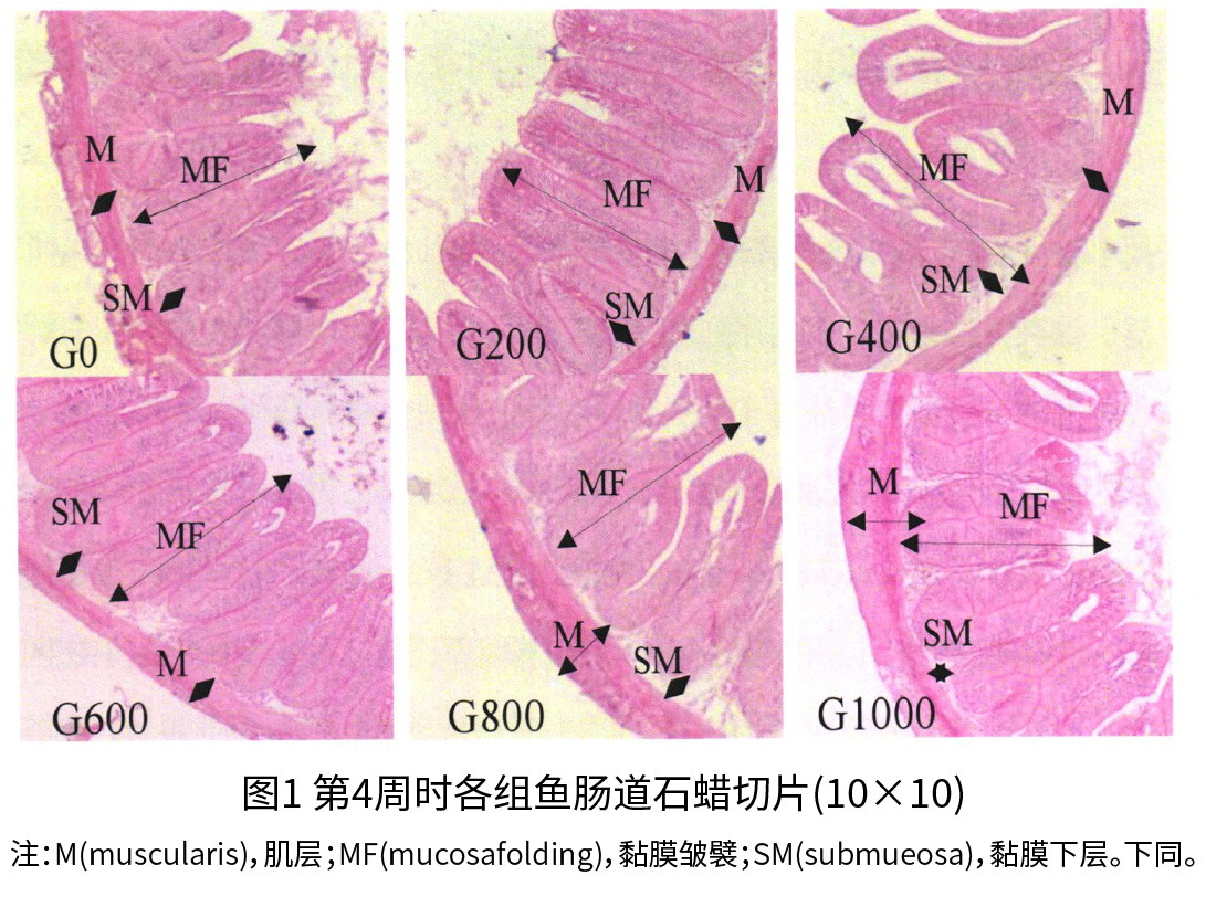 试验结果 (1)饲料中添加低聚木糖对奥尼罗非鱼肠道形态结构的影响 从图1和图2石蜡切片结果可见,第4周和8周时对照组奥尼罗非鱼肠道形态无明显变化,而添加组肠道形态发生明显变化:肠道黏膜皱襞完整、高度较大,皱襞面积较大,黏膜上皮细胞核排列整齐,肌层变厚,各组肠道肌层厚度和皱襞面积见表2所示,第4周时G800组和G1000组肌层厚度显著高于对照组(P<0.05),G400组和G1000组皱襞面积显著高于对照组(P<0.05)。第8周时,各添加组肌层厚度均显著高于对照组(P<0.05),G800组显著高于其他各组(P<0.05),各添加组皱襞面积均显著高于对照组(P<0.05)。