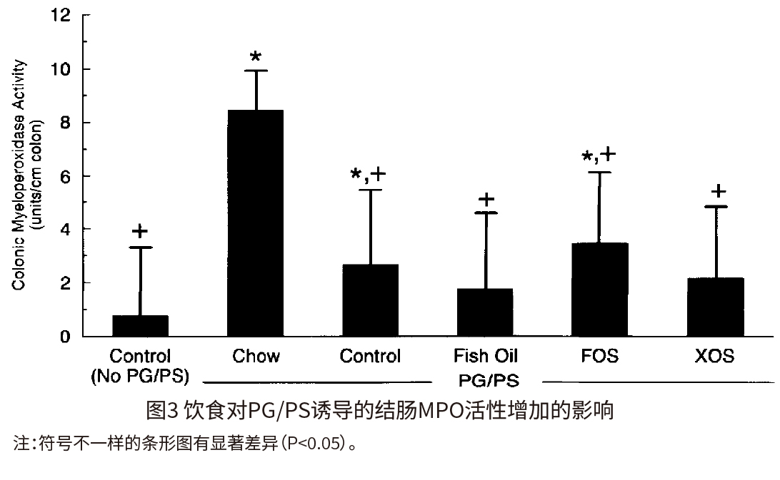 (4)饮食对PG/PS诱导的结肠MPO活性的影响 如图3所示,与Chow组相比,XOS组显著减弱了PG/PS引起的结肠MPO活性增加。