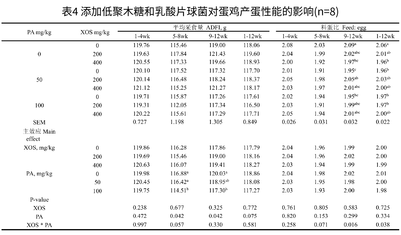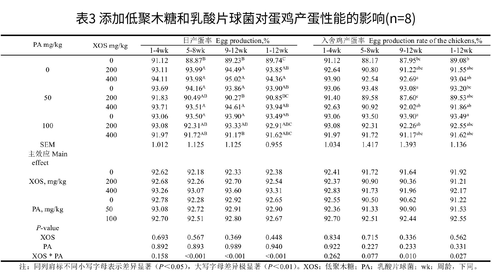 试验目的 本试验旨在研究低聚木糖和乳酸片球菌对蛋鸡产蛋性能和蛋品质的影响。 试验设计 本试验采用3×3二因子试验设计(见表1),XOS设三个添加水平,分别为:0、200、400 mg/kg;乳酸片球菌(PA CNCMI-4622)设三个添加水平,分别为:0、50、100mg/kg。选用1296只48周龄体重相近、机体健康的罗曼粉蛋鸡进行试验,预饲期2周,正式期12周。依据产蛋率无差异原则,随机分为9个处理,每个处理8个重复,每个重复18只鸡。 试验以玉米-豆粕型为基础饲粮,根据NRC(1994)和中国鸡饲养标准(NY/T33-2004)推荐的营养水平以及参考罗曼粉商品蛋鸡饲养管理指南来设计饲料配方,并结合养殖场生产实际来配制饲粮,全期使用粉料。XOS和PA CNCMI-4622均采用逐级预混合的方式来配制。基础饲粮组成及营养水平见表2。 XOS含量为35%。PA CNCMI-4622活菌含量为≥108CFU/g。 饲养日产蛋率(%)=蛋总数(枚)/饲养日鸡只数(只)*100%。 入舍鸡产蛋率(%)=蛋总数(枚)/入舍鸡只数(只)*100%。 平均蛋重(g)=蛋重(g)/产蛋数(枚)。 平均采食量(g)=耗料量(g)/鸡只饲养量(只)。 料蛋比=采食量(kg)/总蛋重(kg)。 入舍鸡产蛋数=产蛋数(枚)/入舍鸡只数(只)。