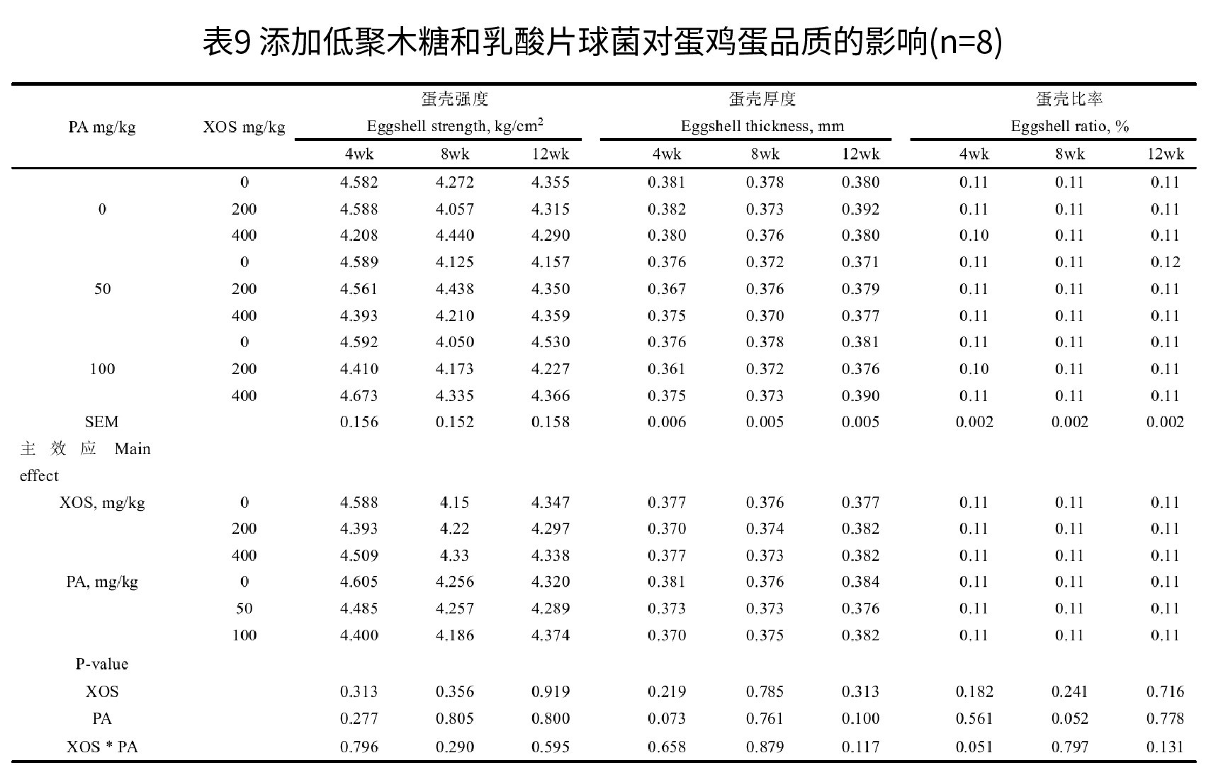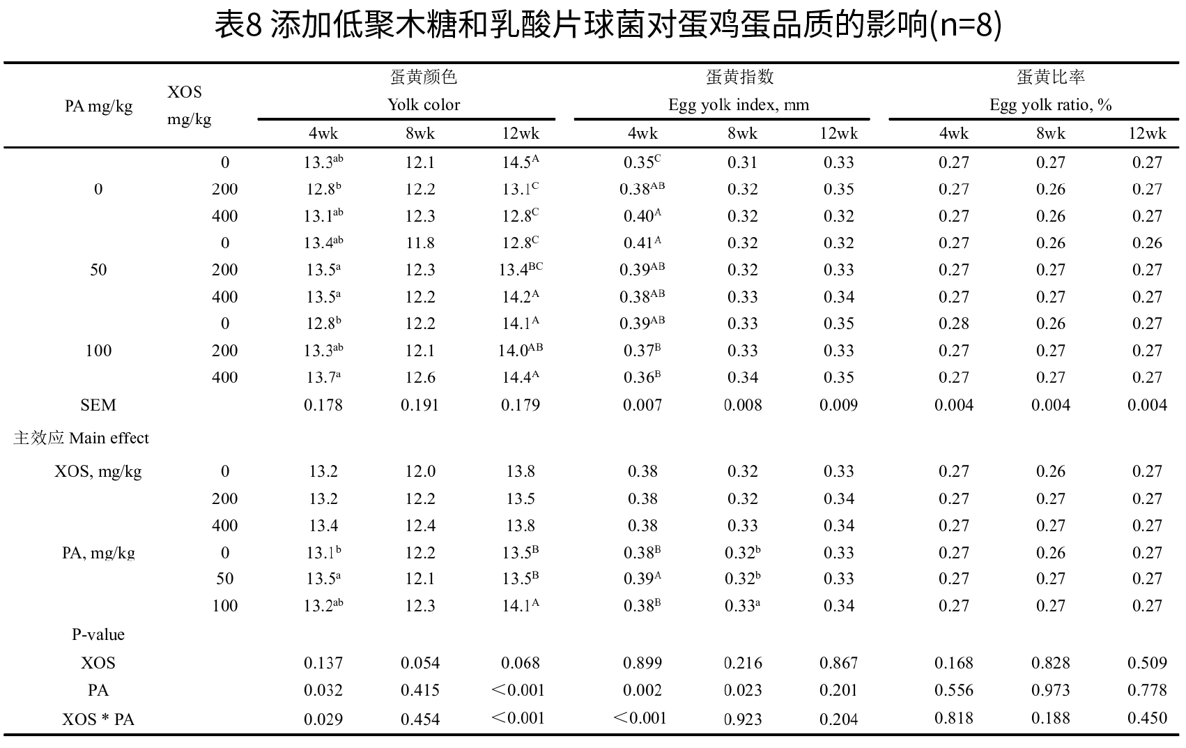 (2)添加低聚木糖和乳酸片球菌对蛋鸡蛋品质的影响 添加XOS和PA对蛋鸡蛋品质的影响见表7、8、9和10。 结果表明,试验第4周时,添加不同水平XOS和PA在蛋黄颜色和蛋黄指数有交互作用(P≤0.03),在蛋黄颜色上,PA 50 mg/kg和XOS 200、400 mg/kg联用及PA 100 mg/kg和XOS 400 mg/kg联用与单独添加PA 100 mg/kg相比显著提高;在蛋黄指数上,单独添加XOS 200、400 mg/kg和单独添加PA 50、100mg/kg均显著提高,但联用组体现出进一步提高。从主效应看,添加XOS 400 mg/kg有提高蛋黄颜色趋势(P=0.054)。 试验第12周时,添加不同水平XOS和PA在蛋白高度、哈氏单位和蛋黄颜色上具有交互效应(P<0.05)。在蛋白高度和哈氏单位,以单独添加XOS 400 mg/kg最高。